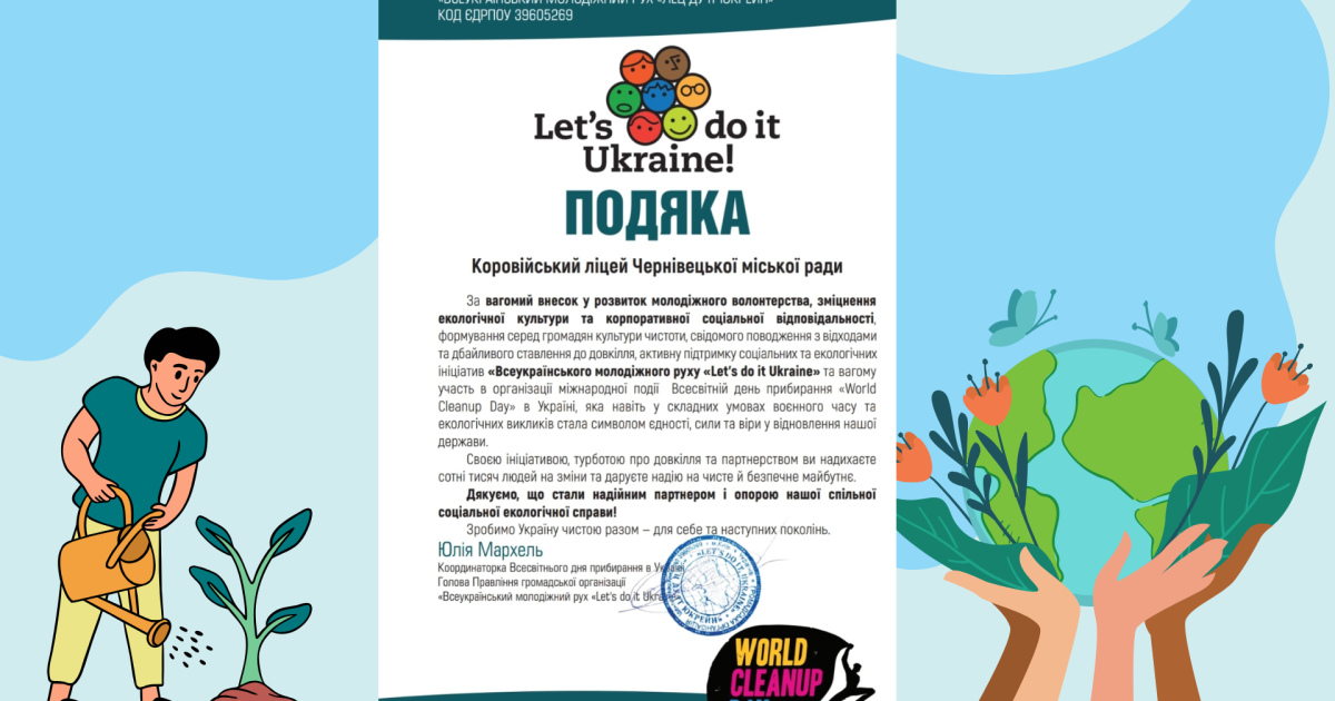 Коровійський ліцей отримав Подяку від Всеукраїнського екологічного руху «Let's do it Ukraine» за активну участь у міжнародній акції «World Cleanup Day» (Всесвітній день прибирання). 🌿